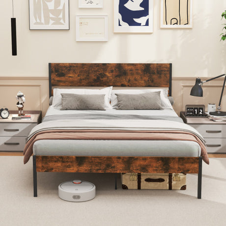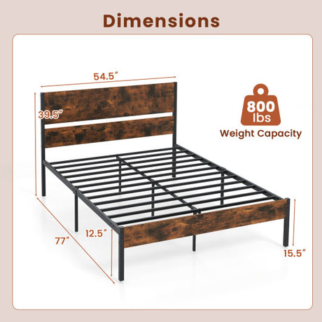 Full Metal Bed Frame Industrial Platform Bed with Wooden Headboard-Full Size