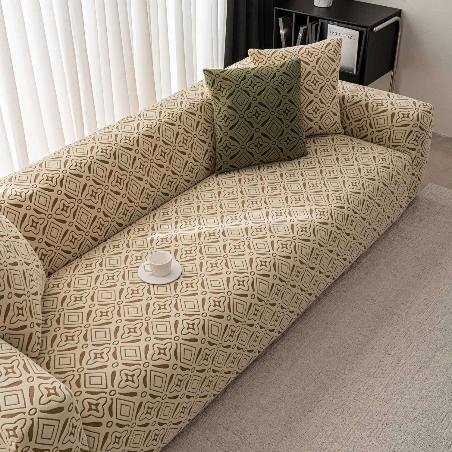 This is a one-piece sofa slipcover made from a soft, jacquard-woven polar fleece fabric. It features a two-tone geometric pattern that is woven directly into the material, giving it a distinct, textured feel. Engineered with a high-stretch fabric blend, the cover is designed to fit snugly over the contours of your couch, creating a clean, tailored appearance with minimal wrinkles. It functions as a furniture protector, offering a durable barrier against pet hair, spills, and daily wear. The cover is machine washable for easy maintenance.