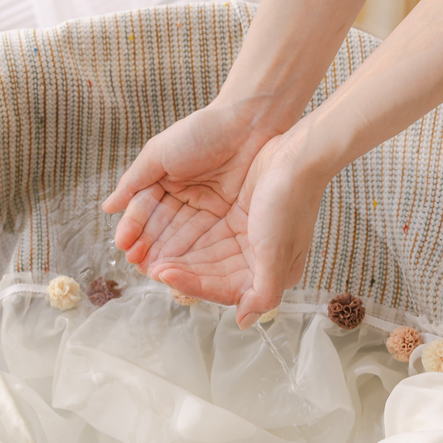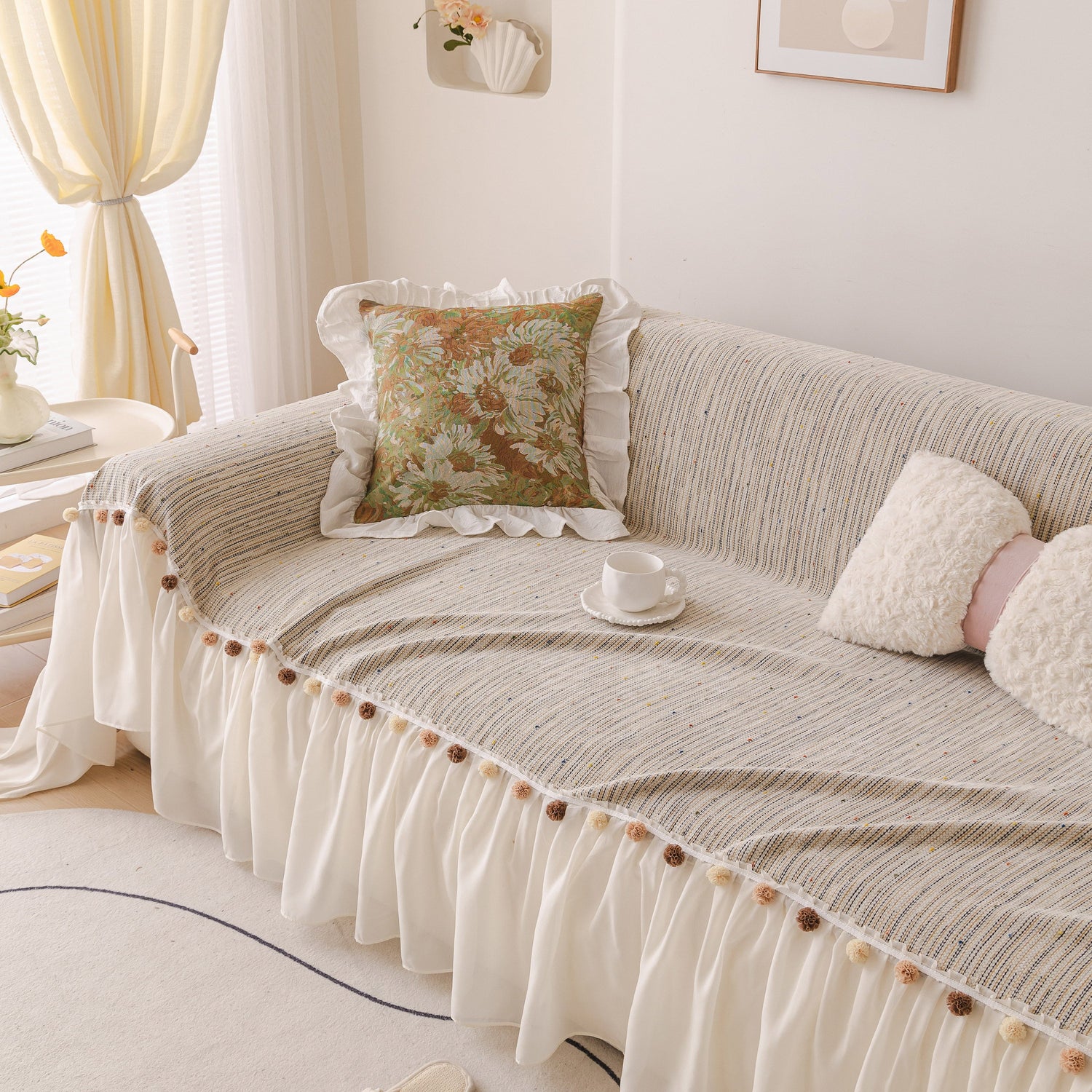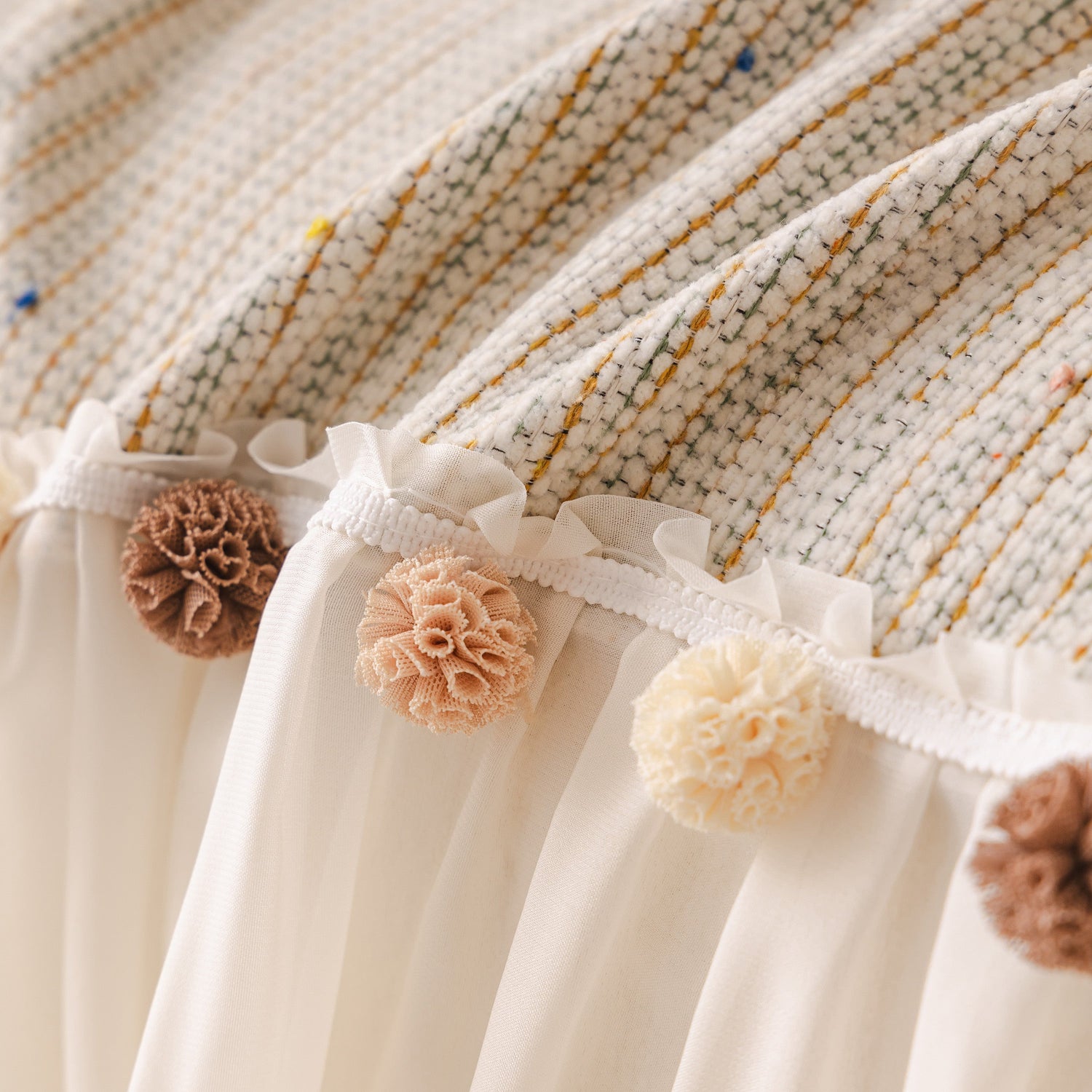 The design features a durable, textured woven top layer, complemented by a dreamy, cascading chiffon ruffle skirt. Joining the two is a delightful line of handcrafted pom-pom fringe tassels, adding a touch of artisanal, vintage charm. This intricate detailing makes it a standout piece of living room decor.