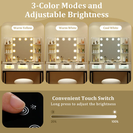 Vanity Desk Set with 3-Color Adjustable LED Lighted Mirror and Drawers-White
