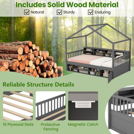 Twin Size House Bed with Roof with 14 Storage Cubes and Enclosed Cabinet-Gray