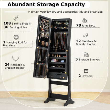 Lockable Freestanding Jewelry Cabinet Armoire with Full-Length Mirror and Lights-Black