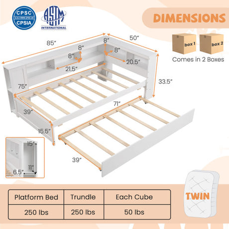 Twin Size Daybed Platform Bed Frame with Trundle and Bedside Shelves-White