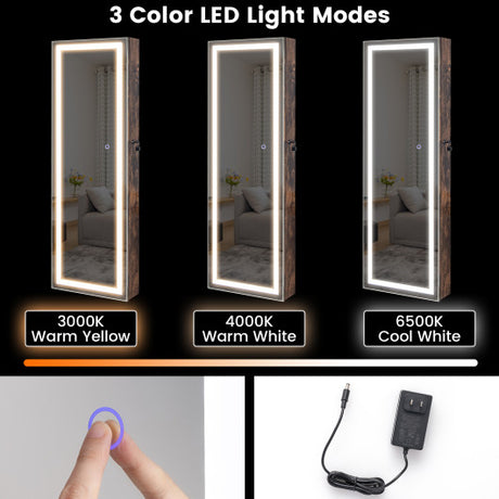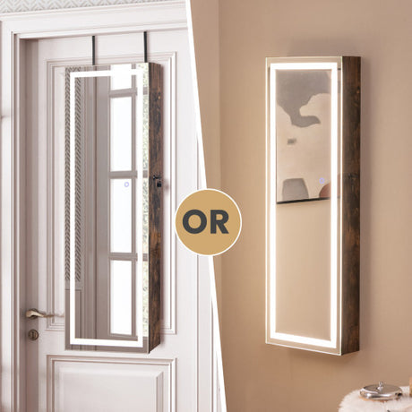 Mirrored Jewelry Armoire with Full Length Mirror and 2 Internal LED Lights-Rustic Brown