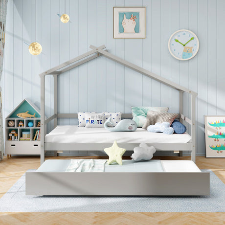 Kids Twin Size House Bed with Trundle and Roof-Gray