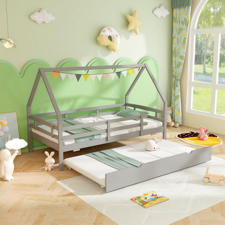 Twin House Bed with Trundle and Fence Rail-Gray