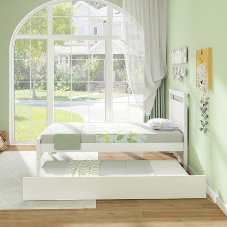 Twin Size Wooden Bed Frame with Trundle for Teens and Adults-White
