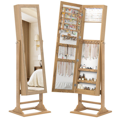 Freestanding Lockable Jewelry Armoire with Full-Length Mirror and 6 LED Lights-Natural