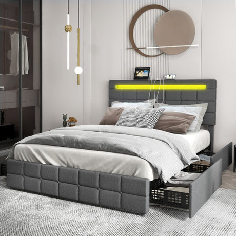 Upholstered LED Bed Frame with Headboard and 4 Drawers-Full Size
