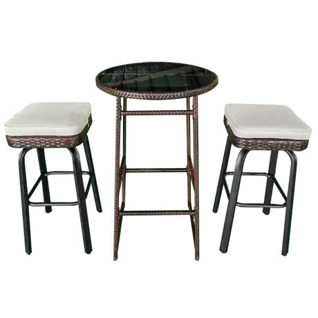 3 Pieces Outdoor Swivel Bar Set PE Rattan Bar Height Table with 2 Chairs-White
