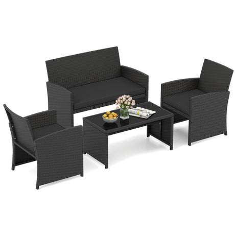 4 Pieces Patio Furniture Set with Tempered Glass Tabletop and Removable Cushion-Black