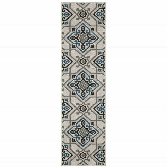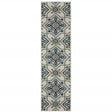 2' X 7' Blue and Beige Oriental Stain Resistant Indoor Outdoor Area Rug