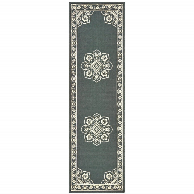 2' X 8' Gray and Ivory Oriental Stain Resistant Indoor Outdoor Area Rug