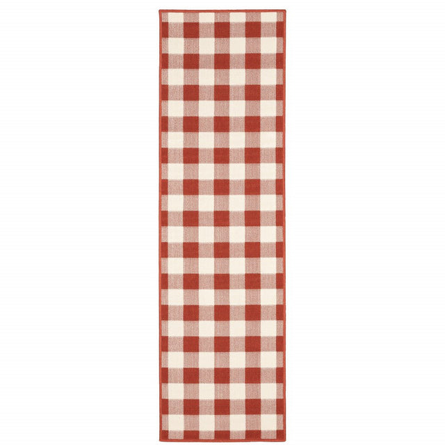 2' X 8' Red and Ivory Geometric Stain Resistant Indoor Outdoor Area Rug