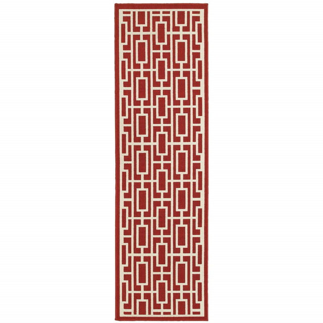 2' X 8' Red and Ivory Geometric Stain Resistant Indoor Outdoor Area Rug