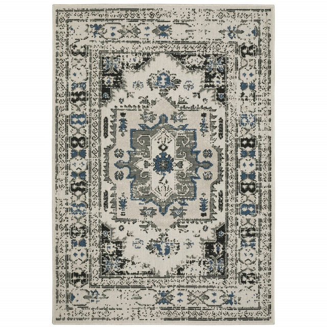 3' X 5' Blue and Beige Oriental Stain Resistant Indoor Outdoor Area Rug