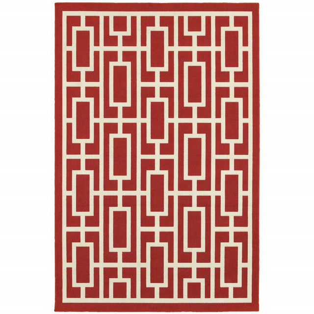 4' X 6' Red and Ivory Geometric Stain Resistant Indoor Outdoor Area Rug