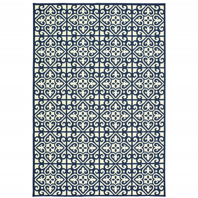 5' X 8' Ivory and Blue Geometric Stain Resistant Indoor Outdoor Area Rug