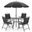 ● Complete Patio Dining Set: This 6-piece patio set includes a practical umbrella a round table and 4 folding chairs making it the perfect addition to your garden deck backyard or poolside. Please avoid exposing the table and chairs to rain to prolong their service life.
