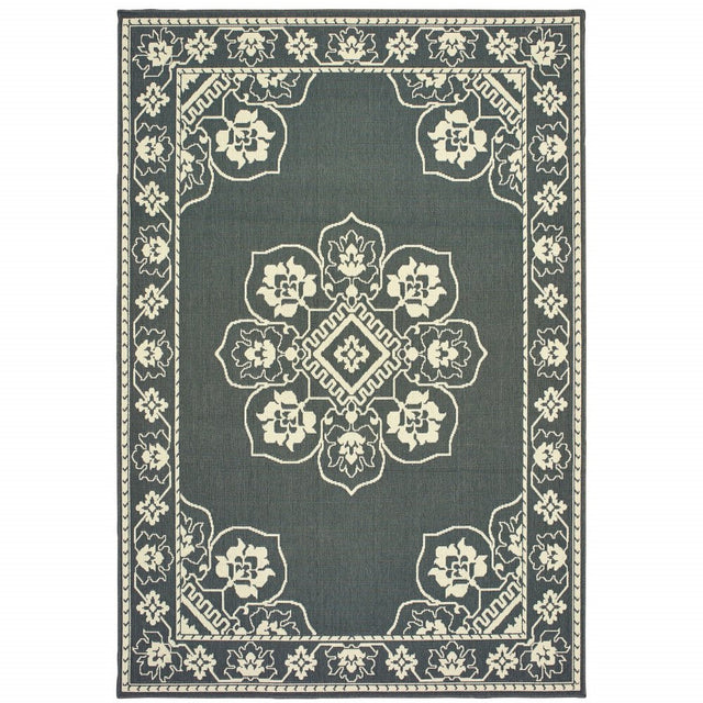 7' X 10' Gray and Ivory Oriental Stain Resistant Indoor Outdoor Area Rug