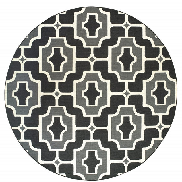 8' X 8' Black and Gray Round Geometric Stain Resistant Indoor Outdoor Area Rug