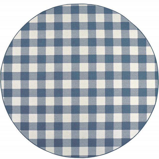 8' X 8' Blue and Ivory Round Geometric Stain Resistant Indoor Outdoor Area Rug