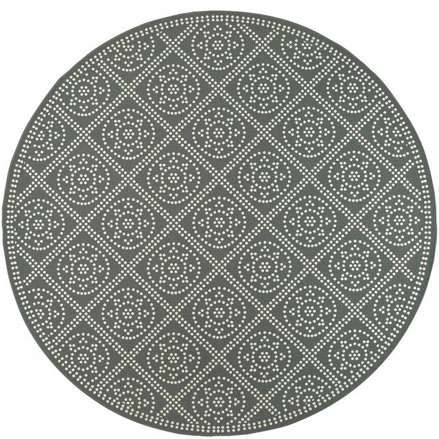 8' X 8' Gray and Ivory Round Geometric Stain Resistant Indoor Outdoor Area Rug