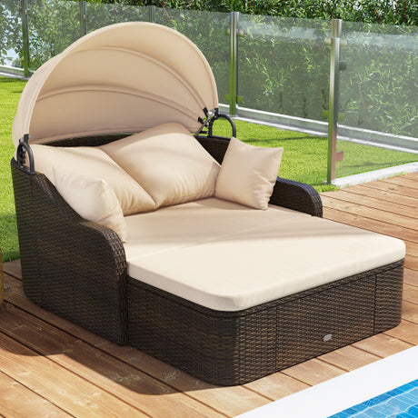 Patio PE Rattan Daybed with Retractable Canopy and Soft Cushions-Beige