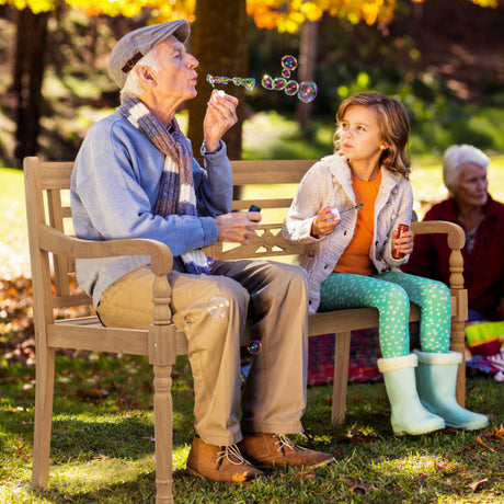 2-Person Teak Wood Patio Bench with Wide Backrest and Curved Armrests