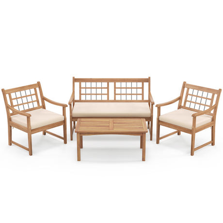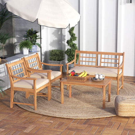 4 Piece Wood Patio Furniture with Armchairs Loveseat and Coffee Table-Off White