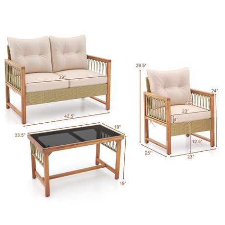 4 Pieces Outdoor Patio PE Wicker Conversation Bistro Set with Acacia Wood Frame-Brown