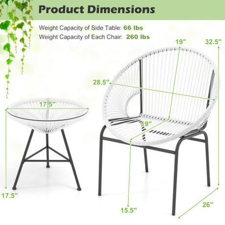 3 Pieces Patio Acapulco Furniture Bistro Set with Glass Table-White