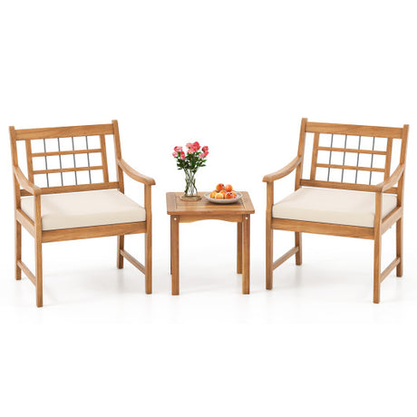 3 Piece Wood Patio Furniture Set with Seat Cushions and Acacia Wood Frame-White