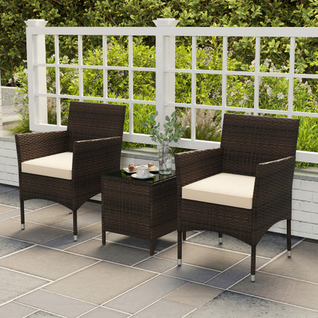 3 Pieces Outdoor Conversation Set with Cushioned Seat and Glass Tabletop-Beige