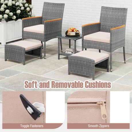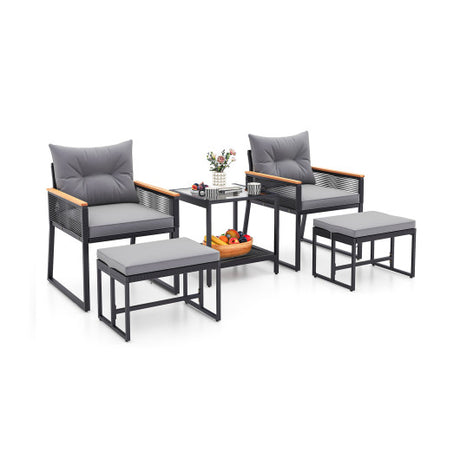 5 Piece Outdoor Rattan Conversation Set with 2-Layer Side Table and 2 Ottomans-Gray