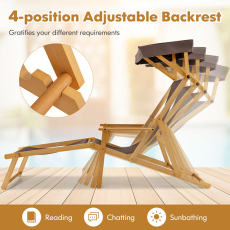 Birch Wood Chaise Lounge Chair Foldable Beach Chair with Adjustable Canopy-Brown