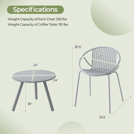 3 Piece Outdoor Bistro Set Patio Metal Chair and Coffee Table Set-Gray