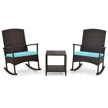 3 Piece Patio Rocking Set Wicker Rocking Chairs with 2-Tier Coffee Table-Turquoise