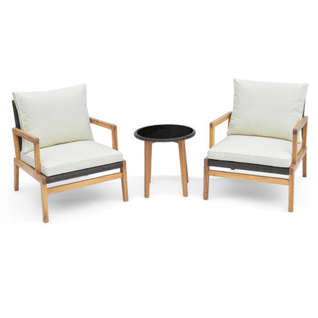 3 Pieces Patio Furniture Set with Cushioned Chairs and Tempered Glass Side Table-Brown