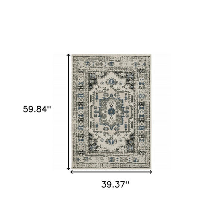 3' X 5' Blue and Beige Oriental Stain Resistant Indoor Outdoor Area Rug