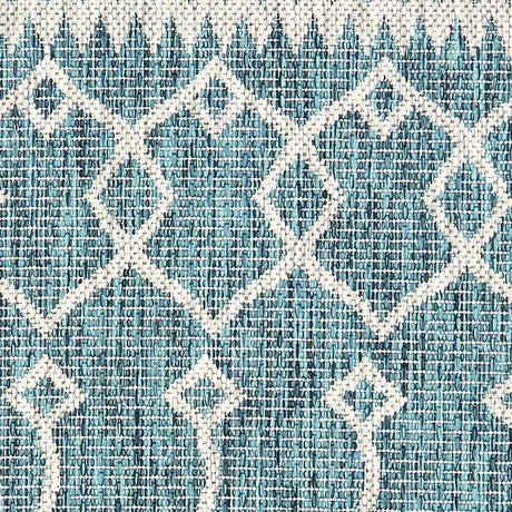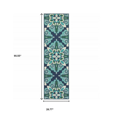 2' X 7' Blue and Beige Geometric Stain Resistant Indoor Outdoor Area Rug