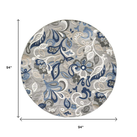 8’ Round Blue Gray Jacobean Floral Indoor Outdoor Area Rug