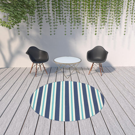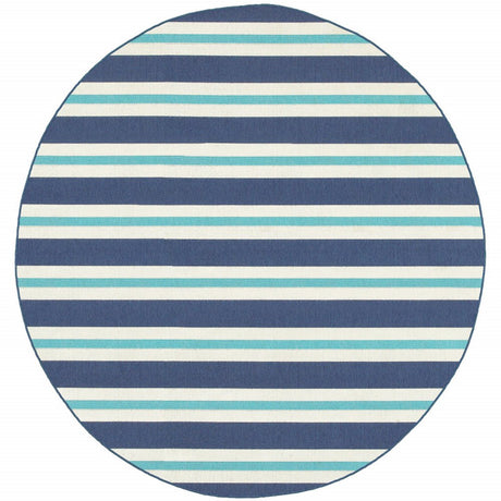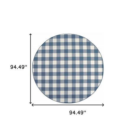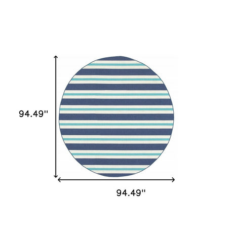 8' X 8' Blue and Ivory Round Geometric Stain Resistant Indoor Outdoor Area Rug