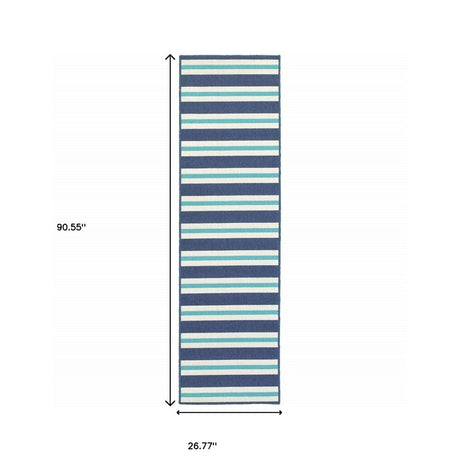 2' X 8' Blue and Ivory Geometric Stain Resistant Indoor Outdoor Area Rug