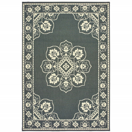 7' X 10' Gray and Ivory Oriental Stain Resistant Indoor Outdoor Area Rug