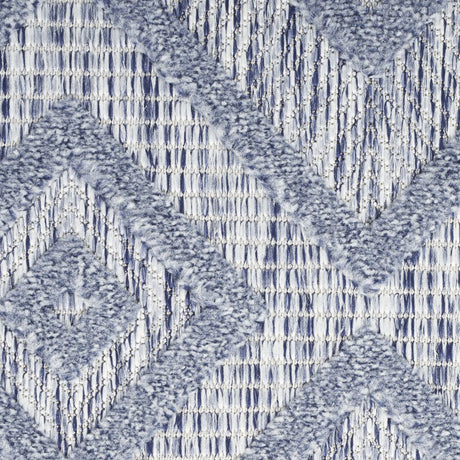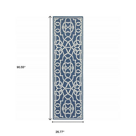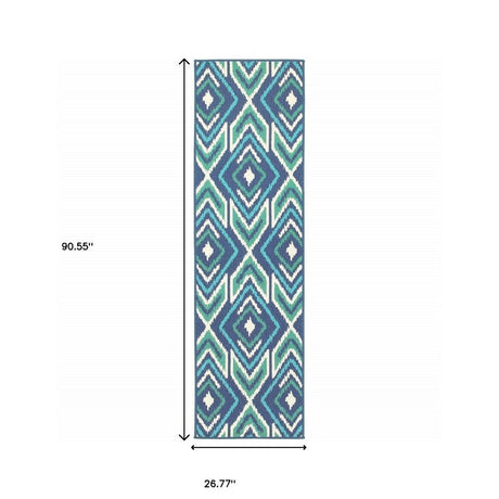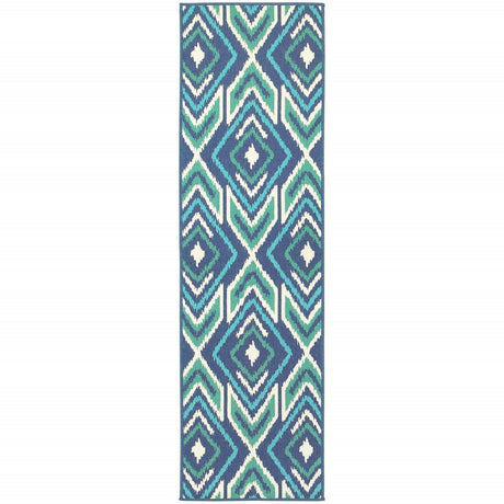 2' X 8' Blue and Ivory Geometric Stain Resistant Indoor Outdoor Area Rug
