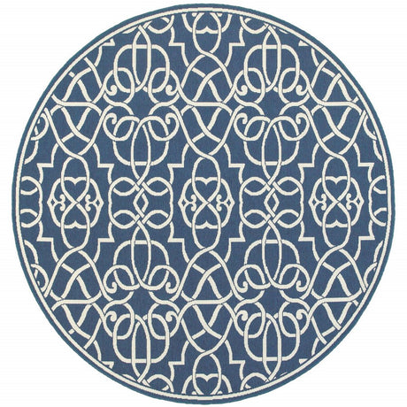 8' X 8' Blue and Ivory Round Geometric Stain Resistant Indoor Outdoor Area Rug