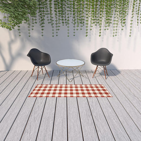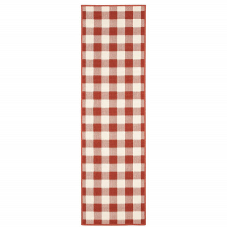 2' X 8' Red and Ivory Geometric Stain Resistant Indoor Outdoor Area Rug