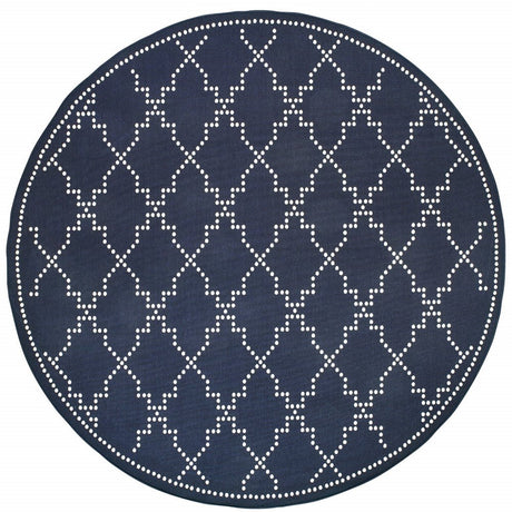 8' X 8' Blue and Ivory Round Geometric Stain Resistant Indoor Outdoor Area Rug