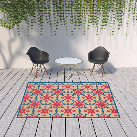 4' X 6' Ivory and Blue Oriental Stain Resistant Indoor Outdoor Area Rug